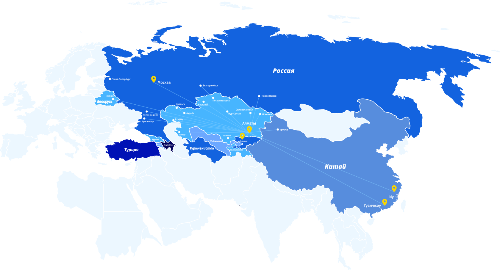 Основными направлениями нашей компании являются Китай - Казахстан, Кыргызстан, Узбекистан, Россия, но мы не ограничиваемся этими странами и доставляем грузы из Китая в более чем 30 стран мира.